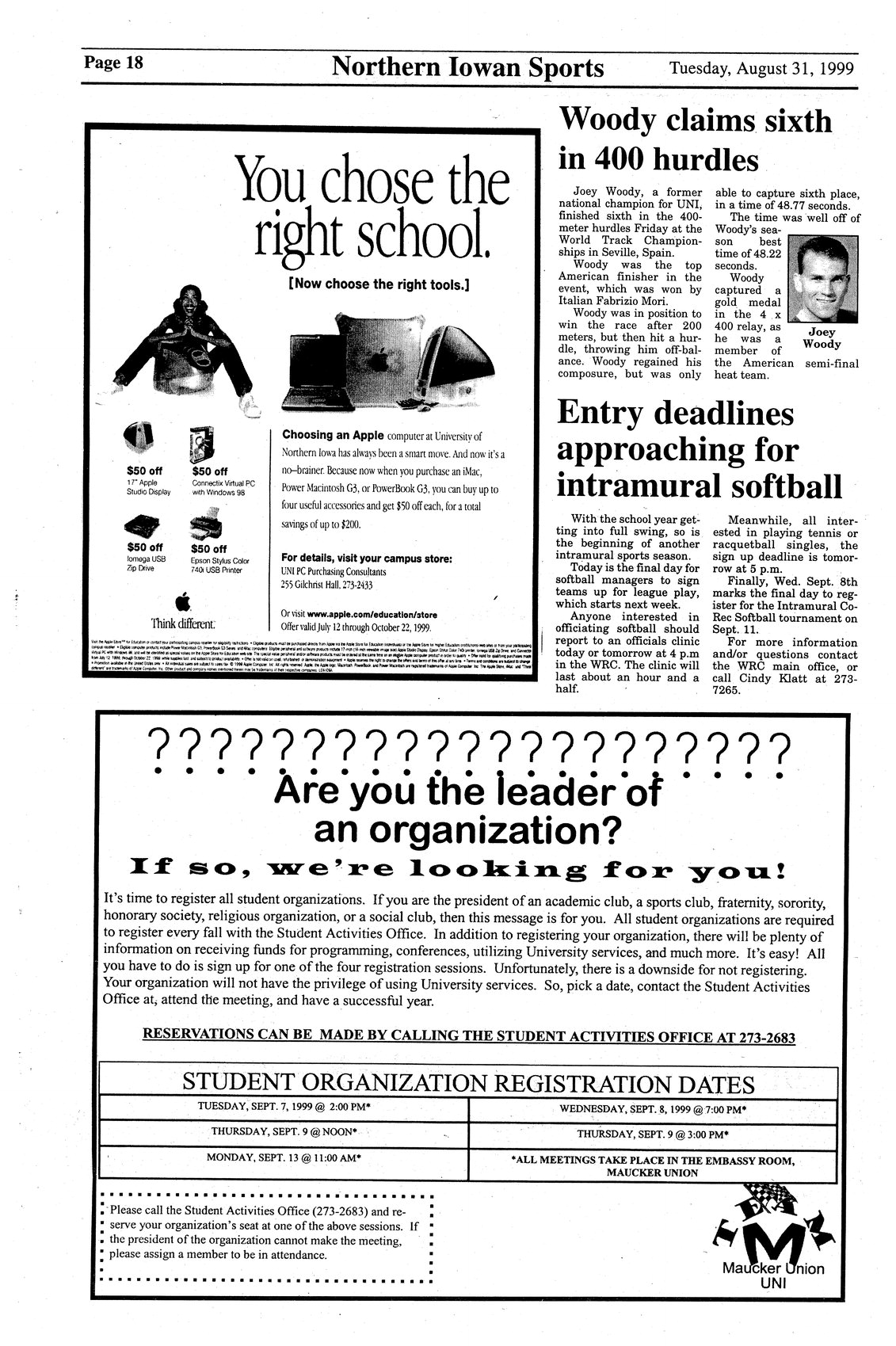 | Woody claims sixth in 400 hurdles | In World Track Championships, former champion for UNI best over all for Americans; photo. |