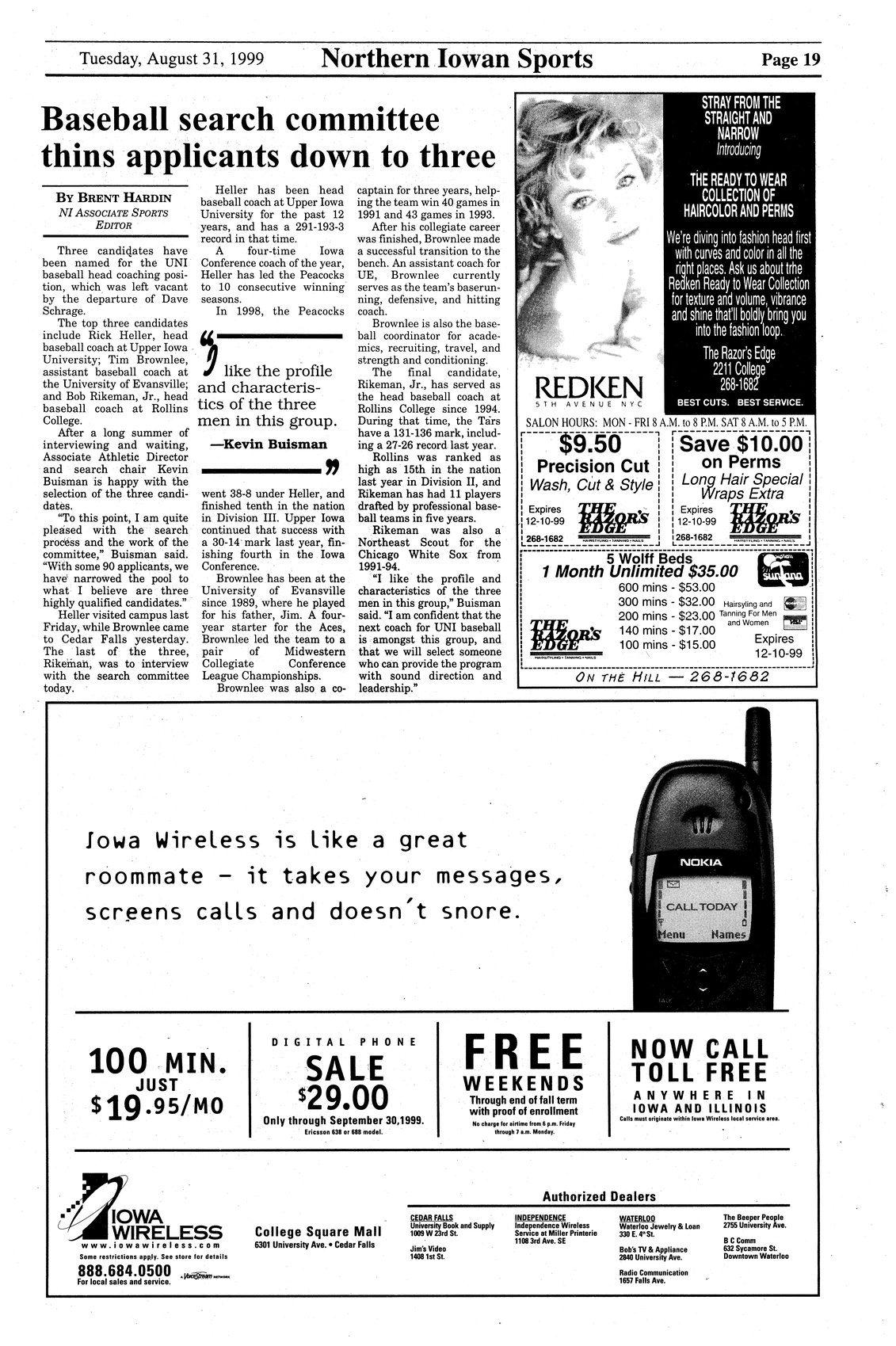 Baseball search committee thins applicants down to three Rick Heller of Upper Iowa University, Tim Brownlee of University of Evansville, and Bob Rikeman, Jr., of Rollins College were selected for interview from ninety applicants.