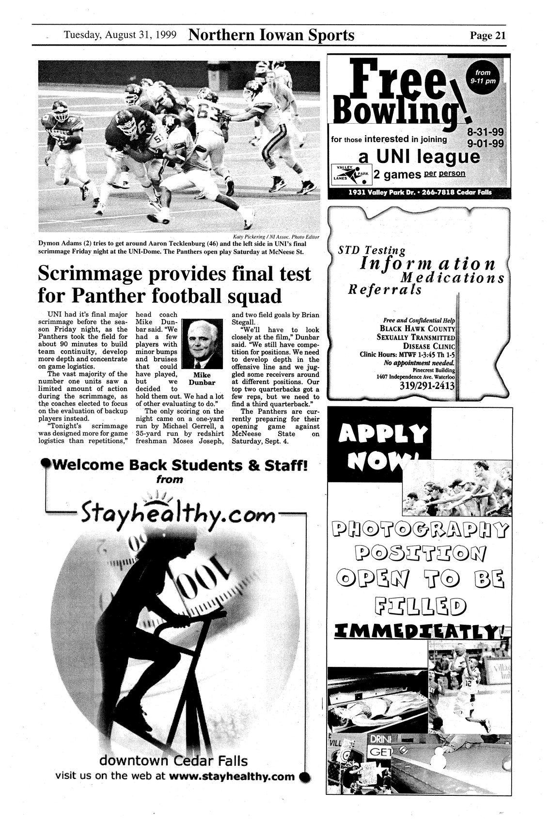| Scrimmage provides final test for Panther football squad | Last pre-season scrimmage held in preparation for opening game against McNeese State on September 4, 1999; positions still being decided; photo. |
