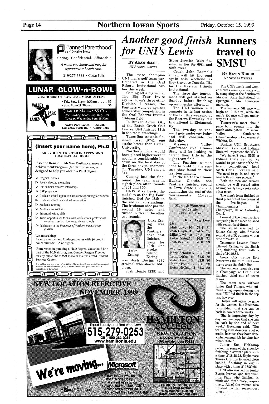 Another good finish for UNI's Lewis Men finished eleventh at Oral Roberts Invite; women will finish fall at Eastern Kentucky Fall Invitational; golf statistics; photo.