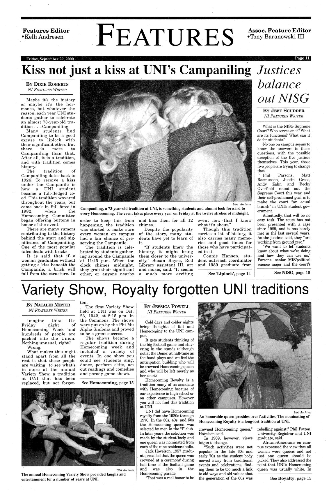 | Variety Show, Royalty forgotten UNI traditions | There has not been a Homecoming queen since 1971 nor a Homecoming variety show since 1993; photos. |