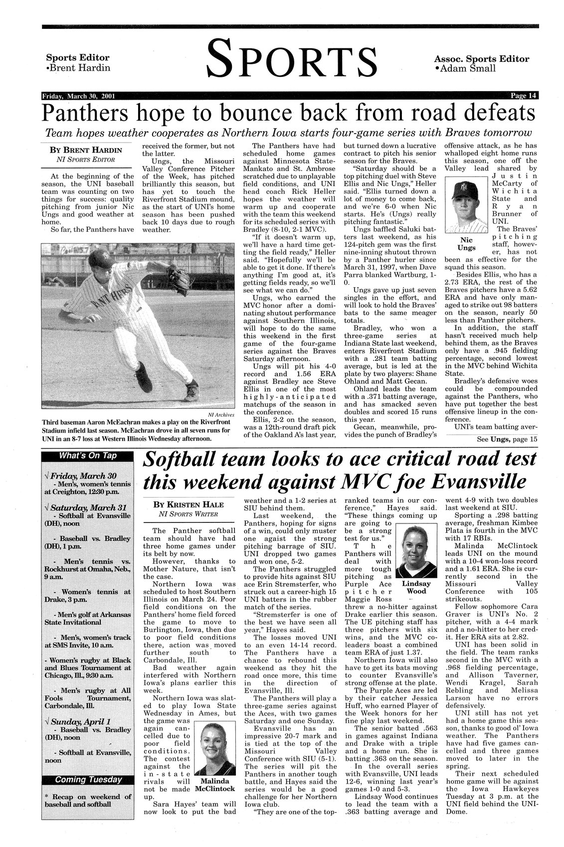 | Softball team looks to ace critical road test this weekend against MVC foe Evansville | Bad weather causes Panther home games to be moved to drier locations; photo. |
