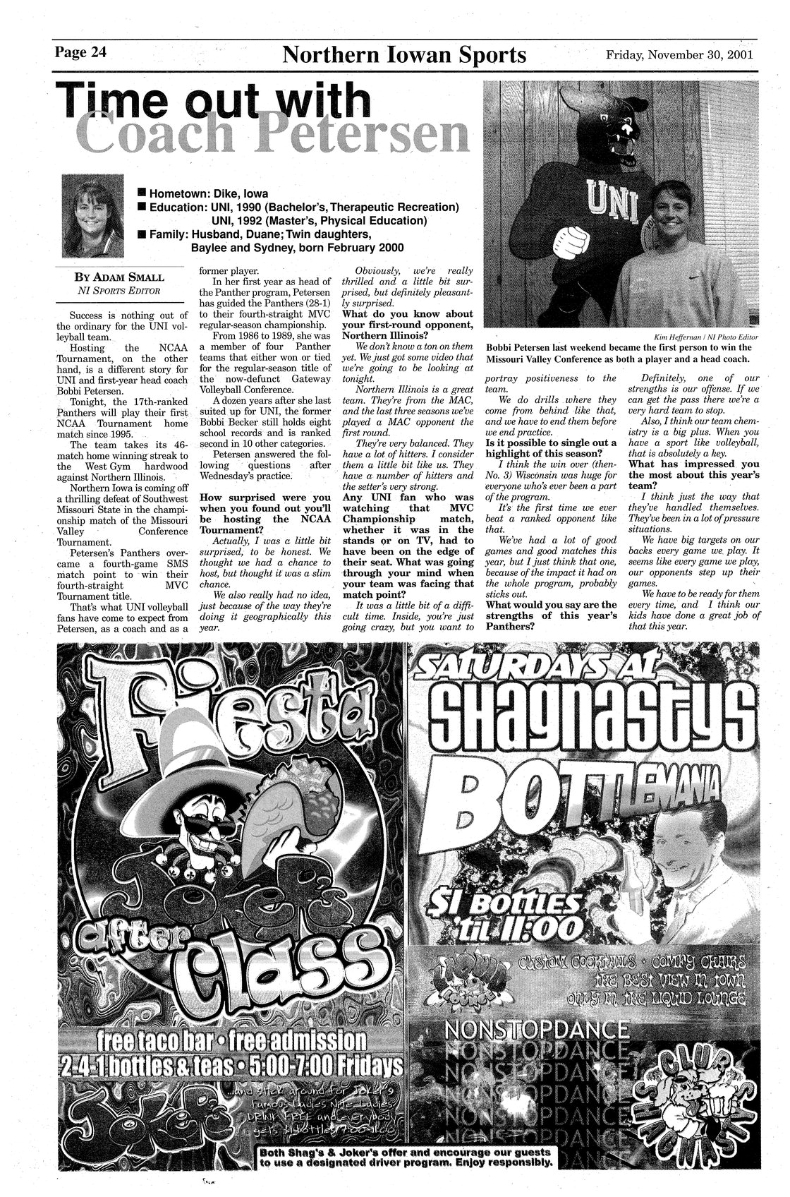 Time out with Coach Petersen Interview with head volleyball coach Bobbi Petersen; photo.
