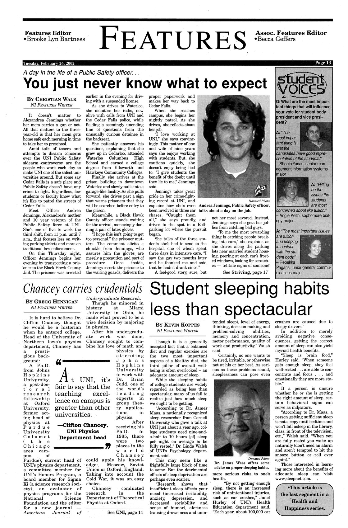 | Student voices | Students respond to the question: " What are the most important things that will influence your vote for student body president and vice president?"; photo. |