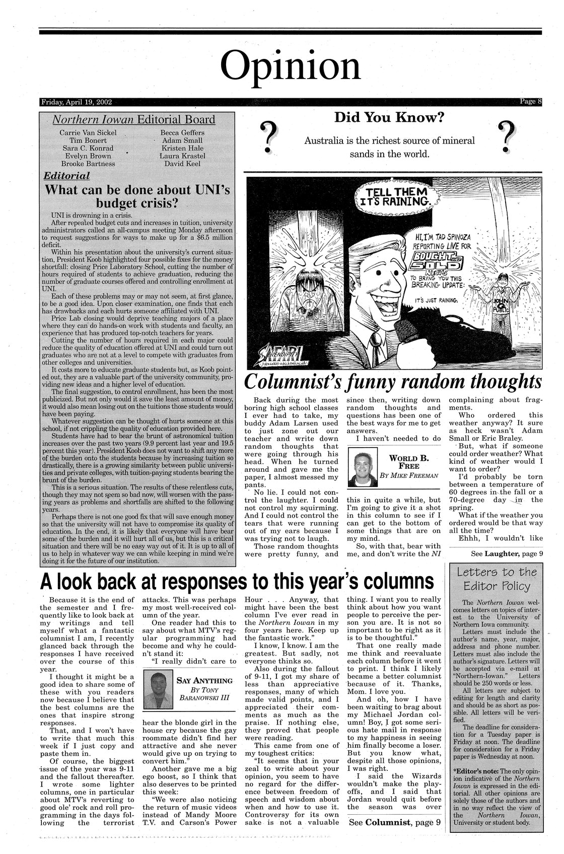 | What can be done about UNI's budget crisis? | Claims that there will be no easy solution to the financial problems UNI is facing, and that someone connected to the university will be hurt no matter what programs are cut. |