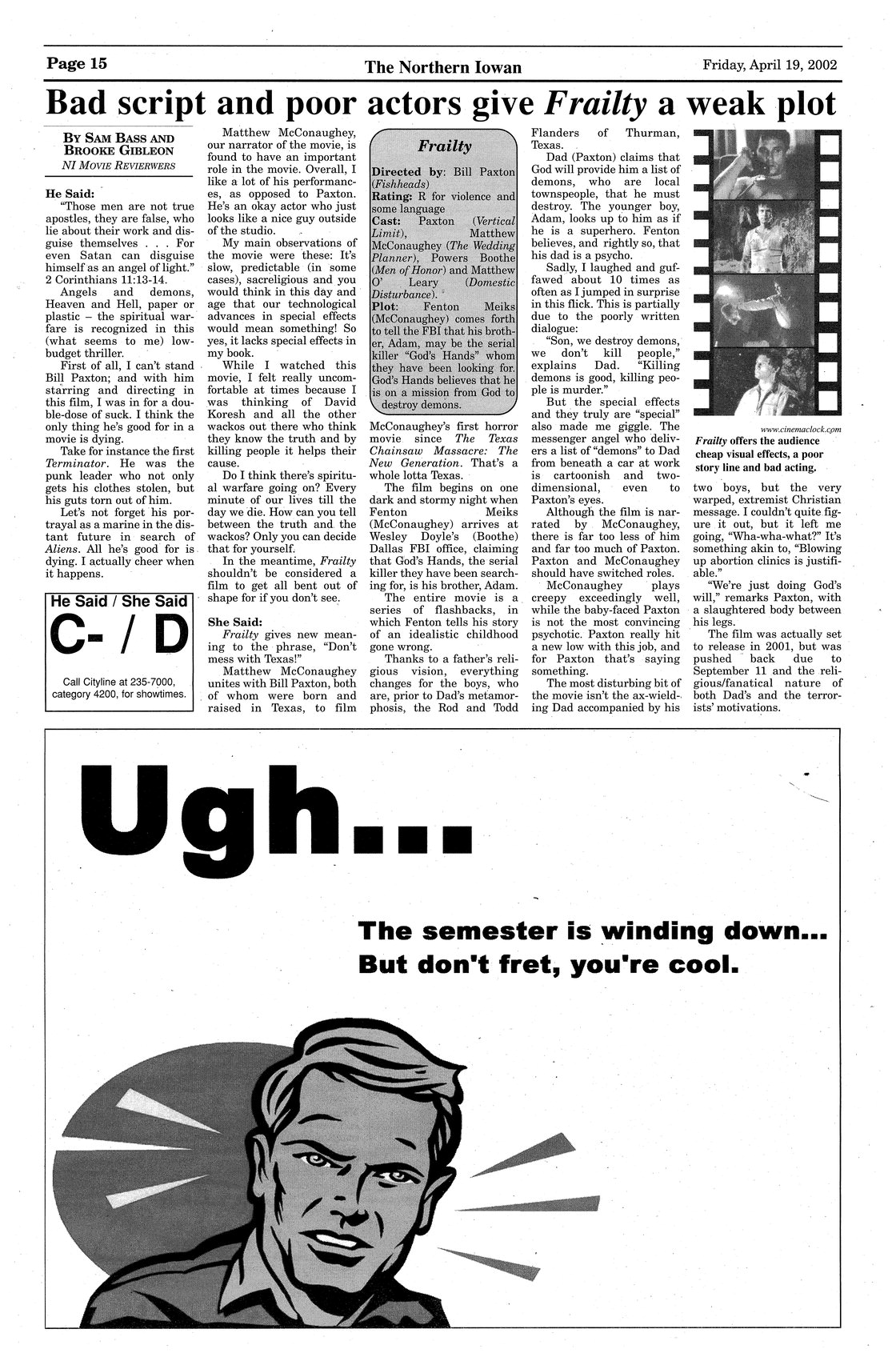 | Bad script and poor actors give 'Frailty' a weak plot | Review of the movie, "Frailty," starring Matthew McConaughey; photo. |