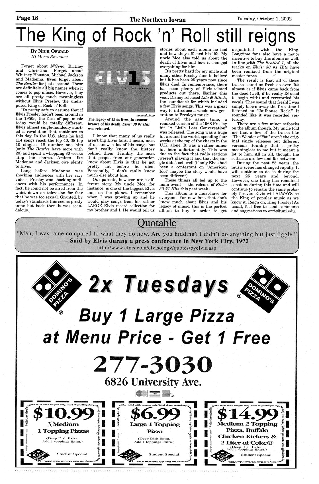 The King of Rock n' Roll still reigns Review of the new release of Elvis Presley's hits in "Elvis: 30 #1 Hits"; photo.