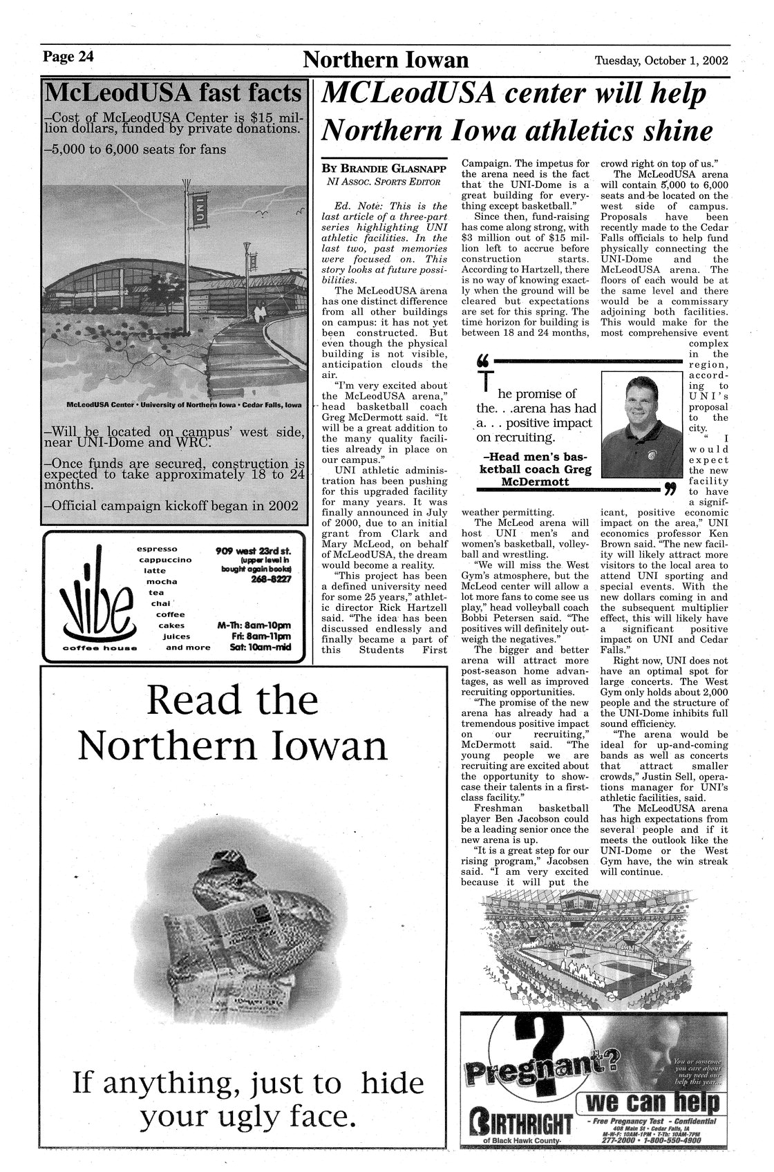 | McLeodUSA Center will help Northern Iowa athletics shine | Students, faculty, and staff believe that the upcoming McLeodUSA Center will have a positive effect on the UNI basketball and volleyball teams, including recruitment; photo. |