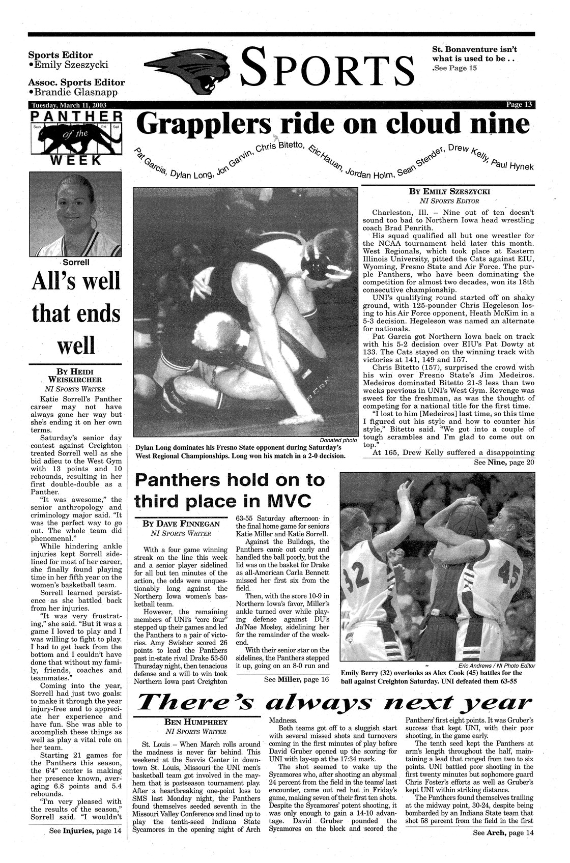 | Grapplers ride on cloud nine | Nine out of ten UNI wrestlers qualified for the NCAA tournament; photo. |