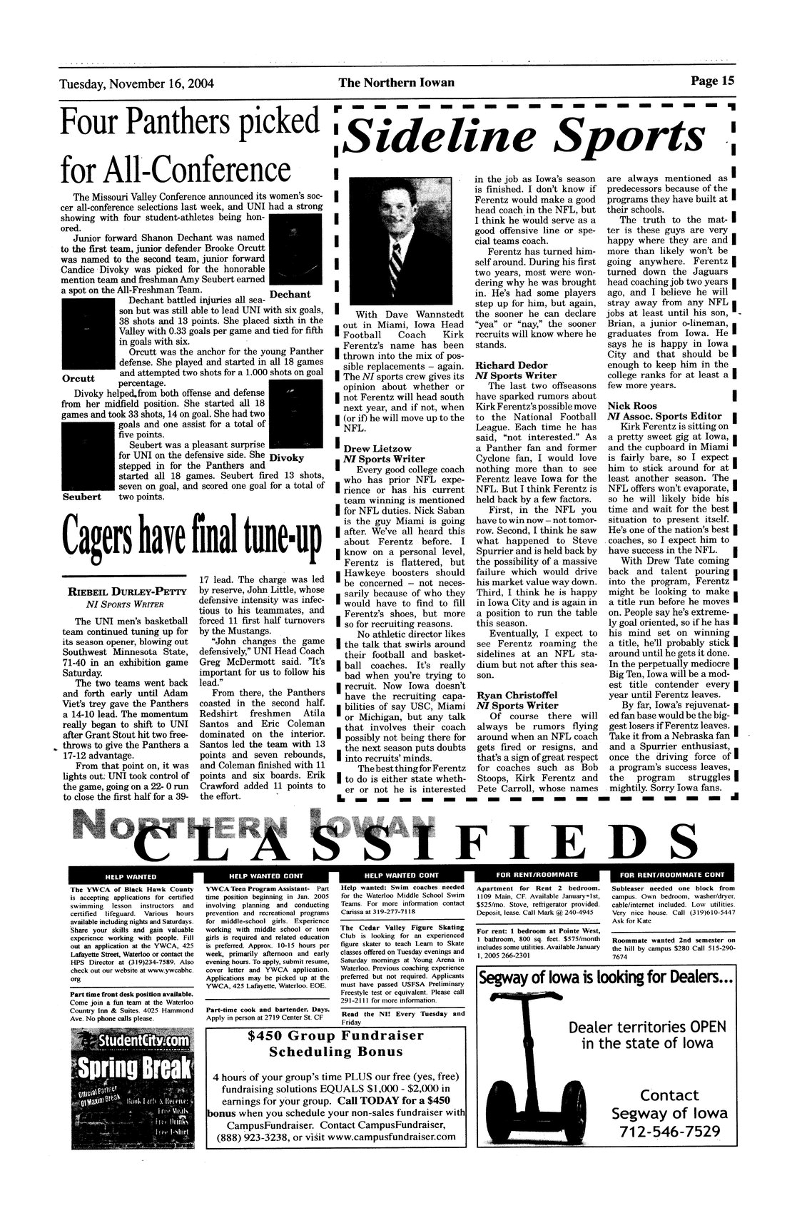 | Sideline sports | NI sportswriters discuss whether or not University of Iowa head football coach Kirk Ferentz will move up to coaching at the professional level; photo. |