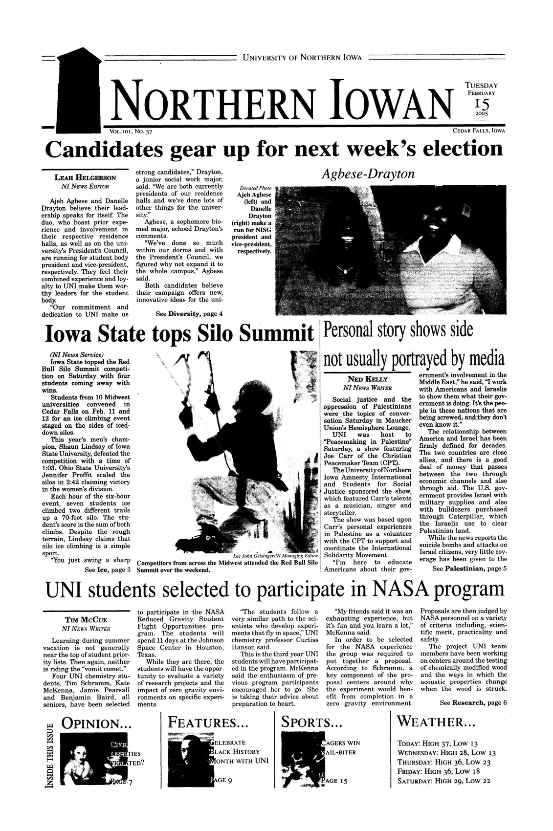 | Iowa State tops Silo Summit | Students from area Midwest colleges participated in the Red Bull Silo Summit on February 11 and 12th; Shaun Lindsey of ISU and Jennifer Proffit of Ohio State University were the winners; photo. |