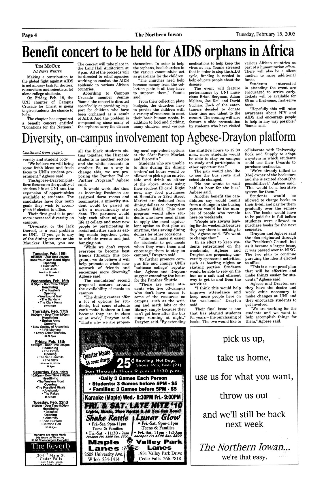 | Benefit concert to be held for AIDS orphans in Africa | UNI chapter of Campus Crusade for Christ is organizing a benefit concert; some UNI students will perform. |