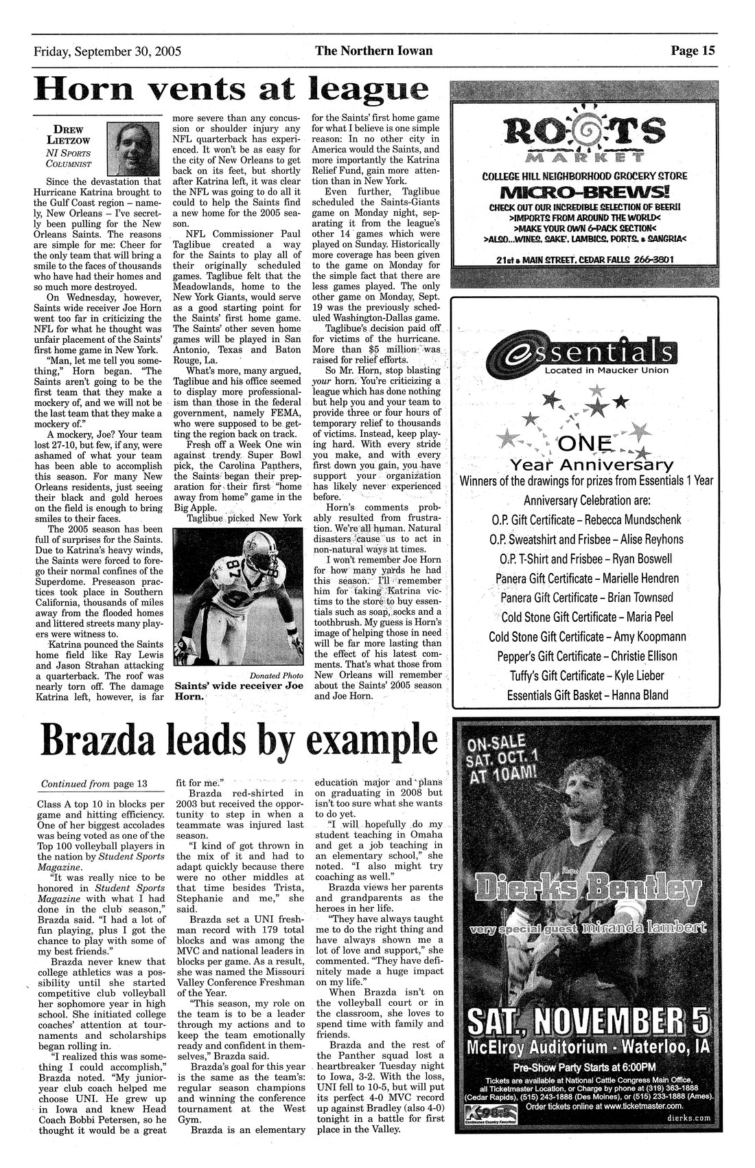 | Horn vents at league | New Orleans Saints' wide receiver Joe Horn sounded off on placement of team's first home game in New York after devastation of Hurricane Katrina; writer provides anecdotes, citing money raised; photo. |