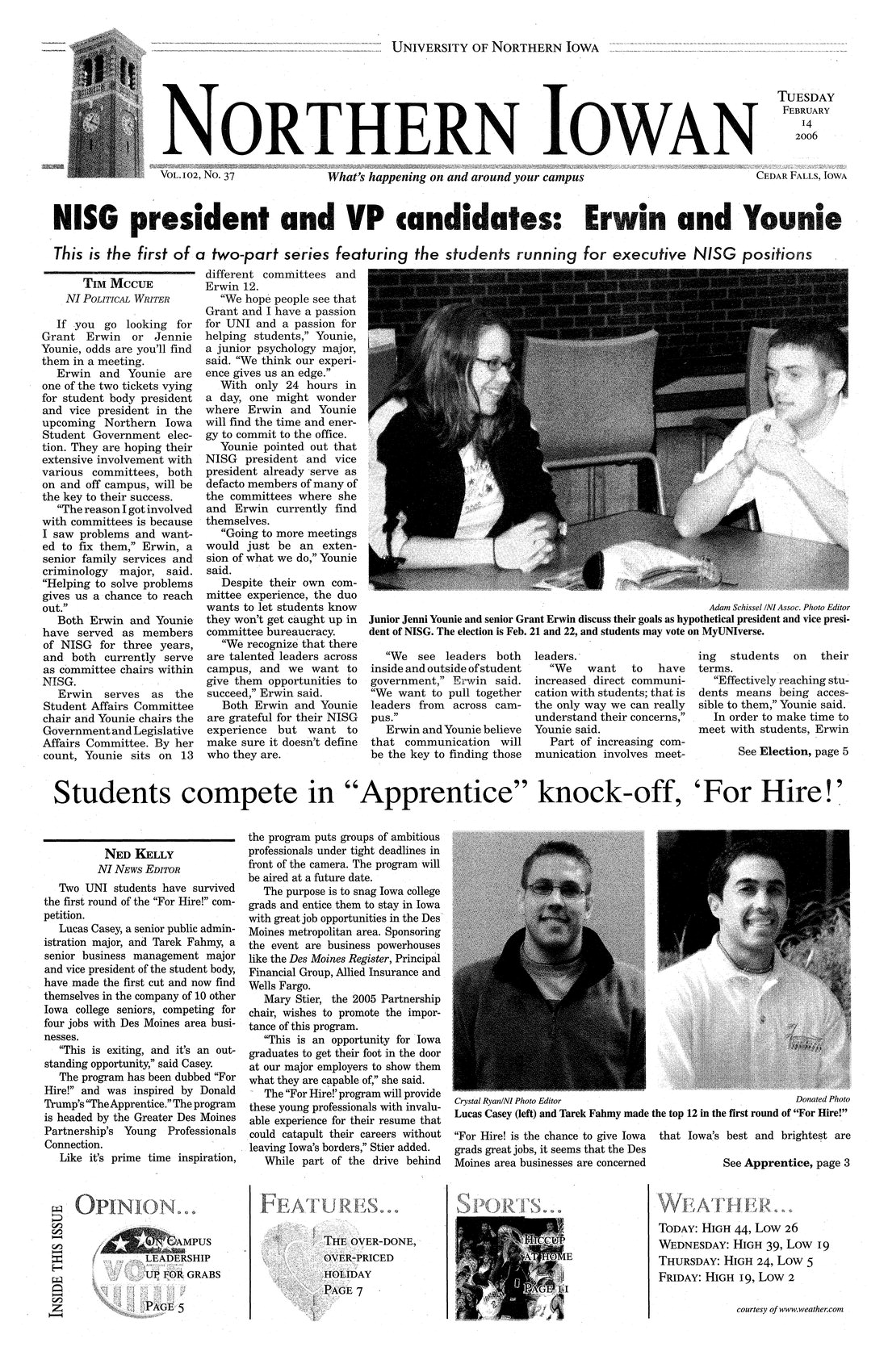 | NISG president and VP candidates: Erwin and Younie; this is the first of a two-part series featuring the students running for executive NISG positions | Grant Erwin and Jennie Younie talk about their qualifications for NISG and their platform; photo. |