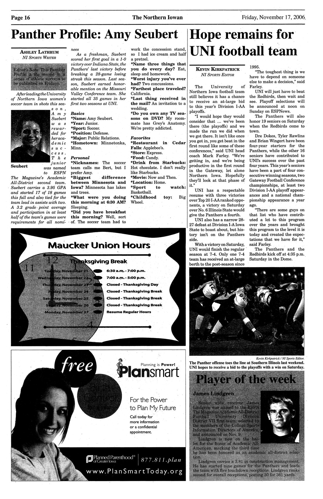 | Player of the week | James Lindgren named to ESPN The Magazine Academic All-District team; photo. |