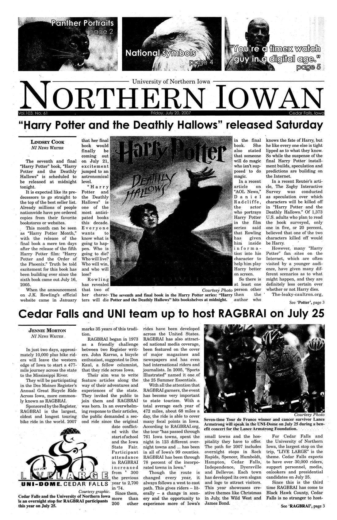 | Cedar Falls and UNI team up to host RAGBRAI on July 25 | Over ten thousand bike riders will stay overnight July 25 in Cedar Falls. UNI will serve as the main staging area; photo. |