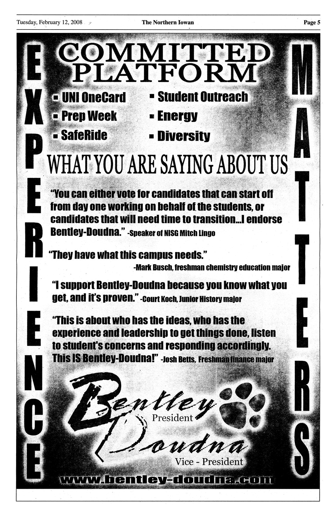 | Committed Platform | Political advertisement for Adam Bentley and Bart Doudna, candidates for president and vice-president of the student body. |