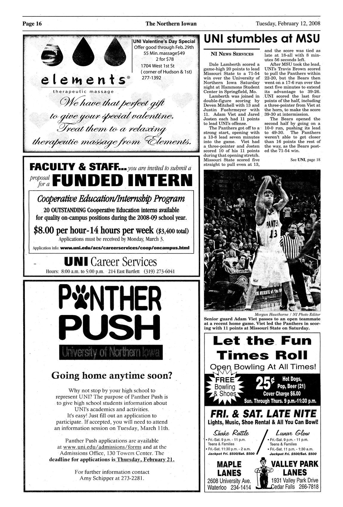 | UNI stumbles at MSU | Men's basketball team loses at Missouri State, 71-54; photo. |