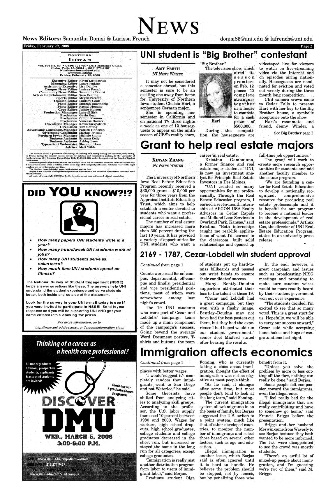 | UNI student is "Big Brother" contestant | Chelsia Hart is spending the semester in California and on national television's "Big Brother" reality show; photo. |