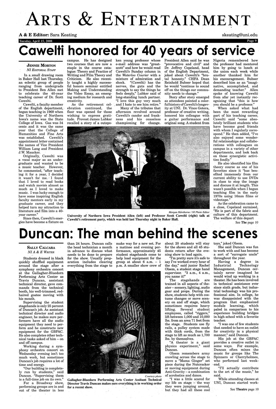 | Duncan: the man behind the scenes | The life and responsibilities of Travis Duncan of the Gallagher-Bluedorn Performing Arts Center; photo. |