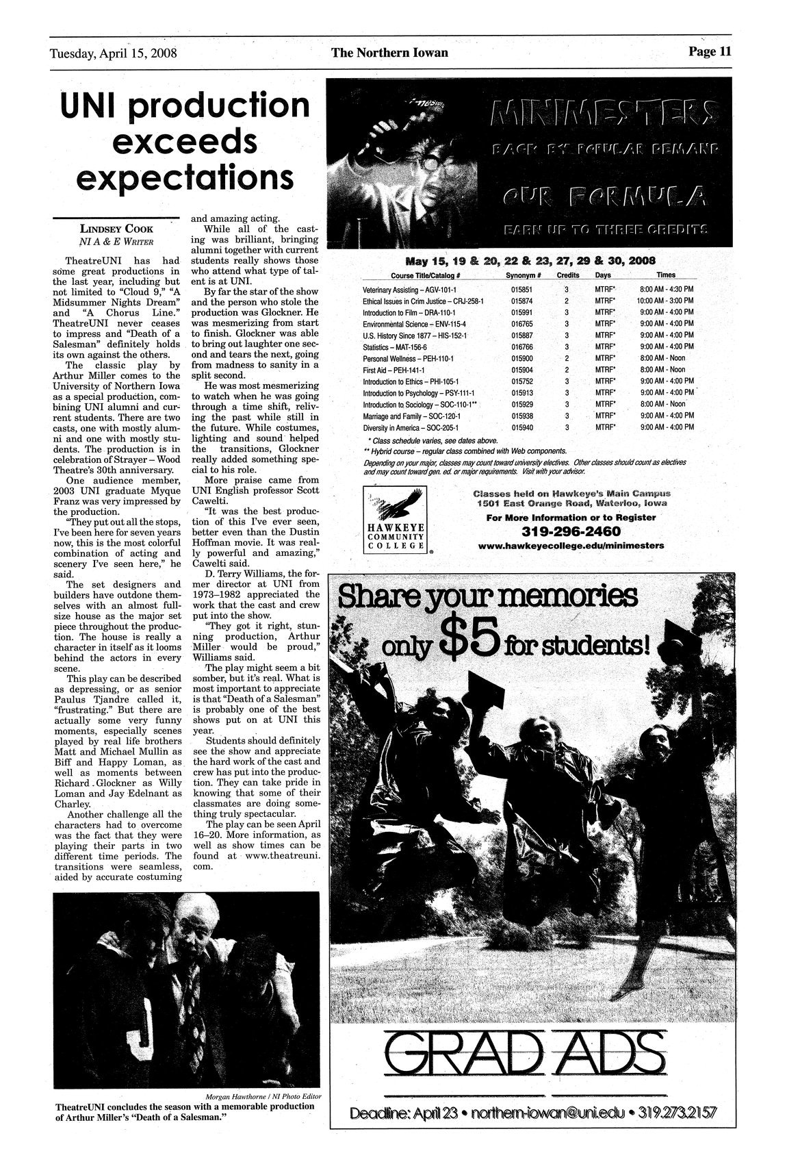 | UNI production exceeds expectations | Review of "Death of a Salesman" production by Theatre UNI; photo. |