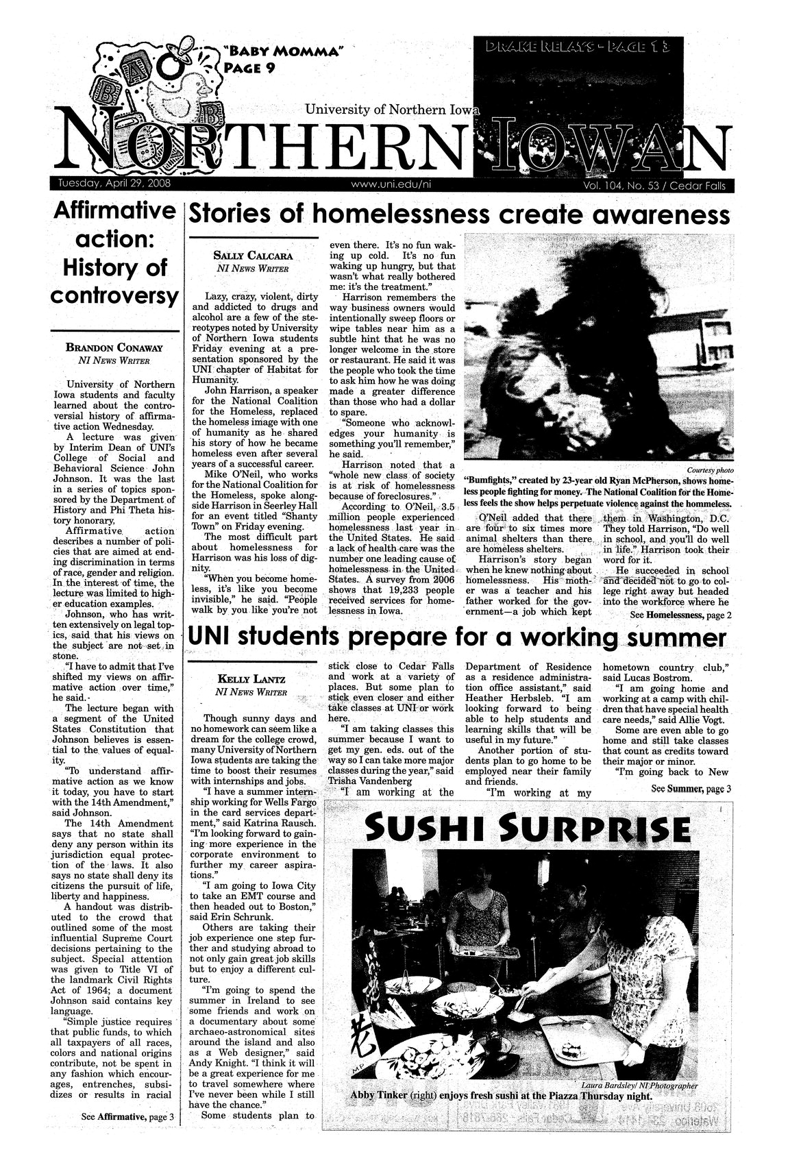 | Stories of homelessness create awareness | John Harrison, a speaker for the National Coalition for the Homeless, spoke to students. His message replaced the homeless image with one of humanity; photo. |