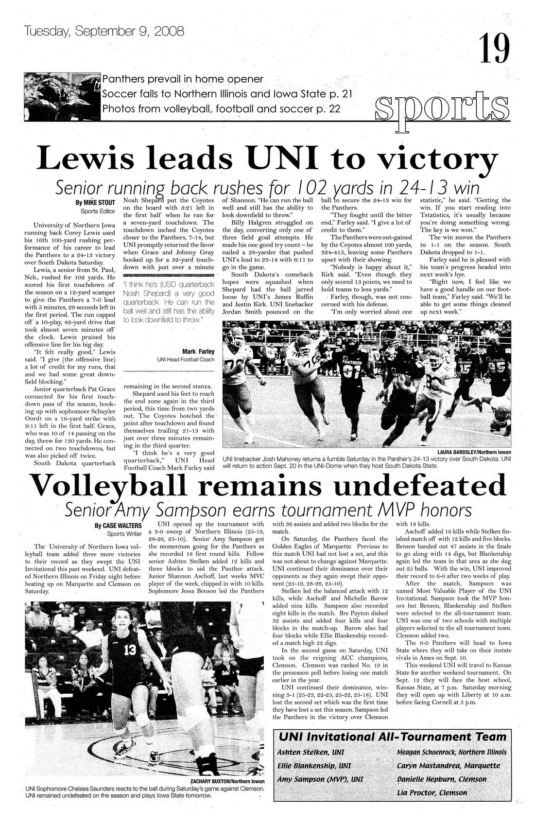 | Lewis leads UNI to victory | Corey Lewis ran for 102 yards in the victory over South Dakota. Panthers won the football game, 24-13; photo. |