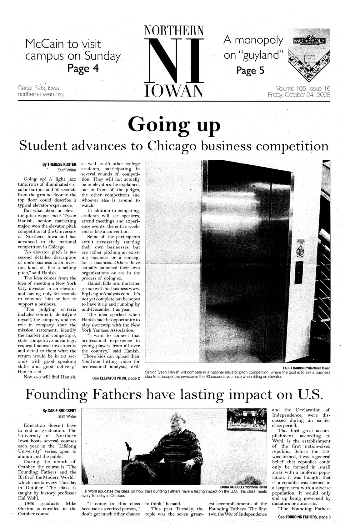 | Going up | Tyson Hanish will be among the forty contestants in an elevator pitch competition in Chicago. Contestants must make a sales pitch to an investor in ninety seconds; photo. |