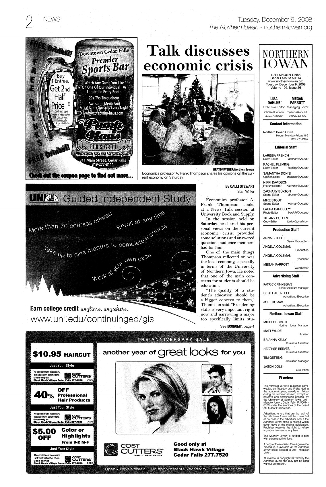 | Talk discusses economic crisis | Professor Frank Thompson speaks at University Book and Supply panel; offers opinions on current economic problems; notes large expenditures for athletics that might well have benefited general education and instruction; photo. |