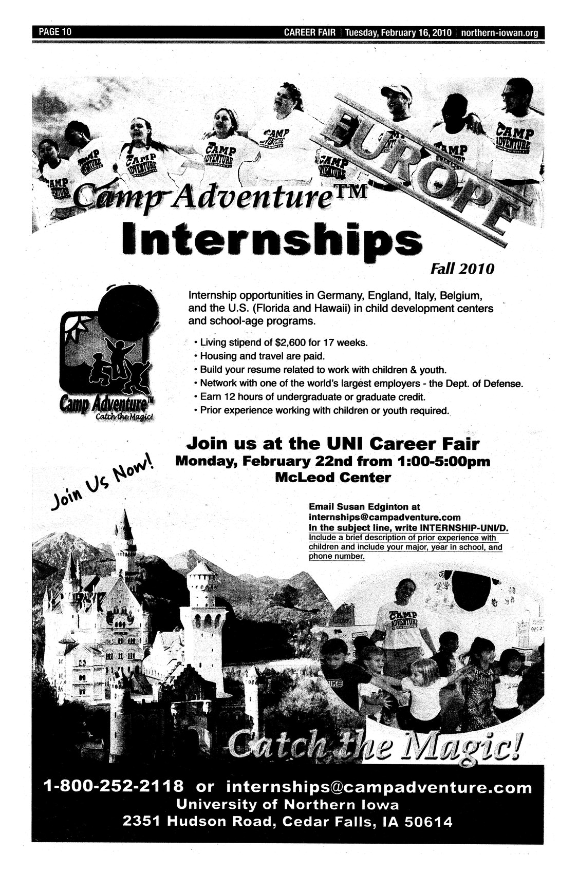 | Camp Adventure Internships | Internships pay $2600 for seventeen weeks; housing and travel are paid. Twelve hours of college credit is included. Opportunities exist in Germany, England, Italy, and Belgium; photo. |