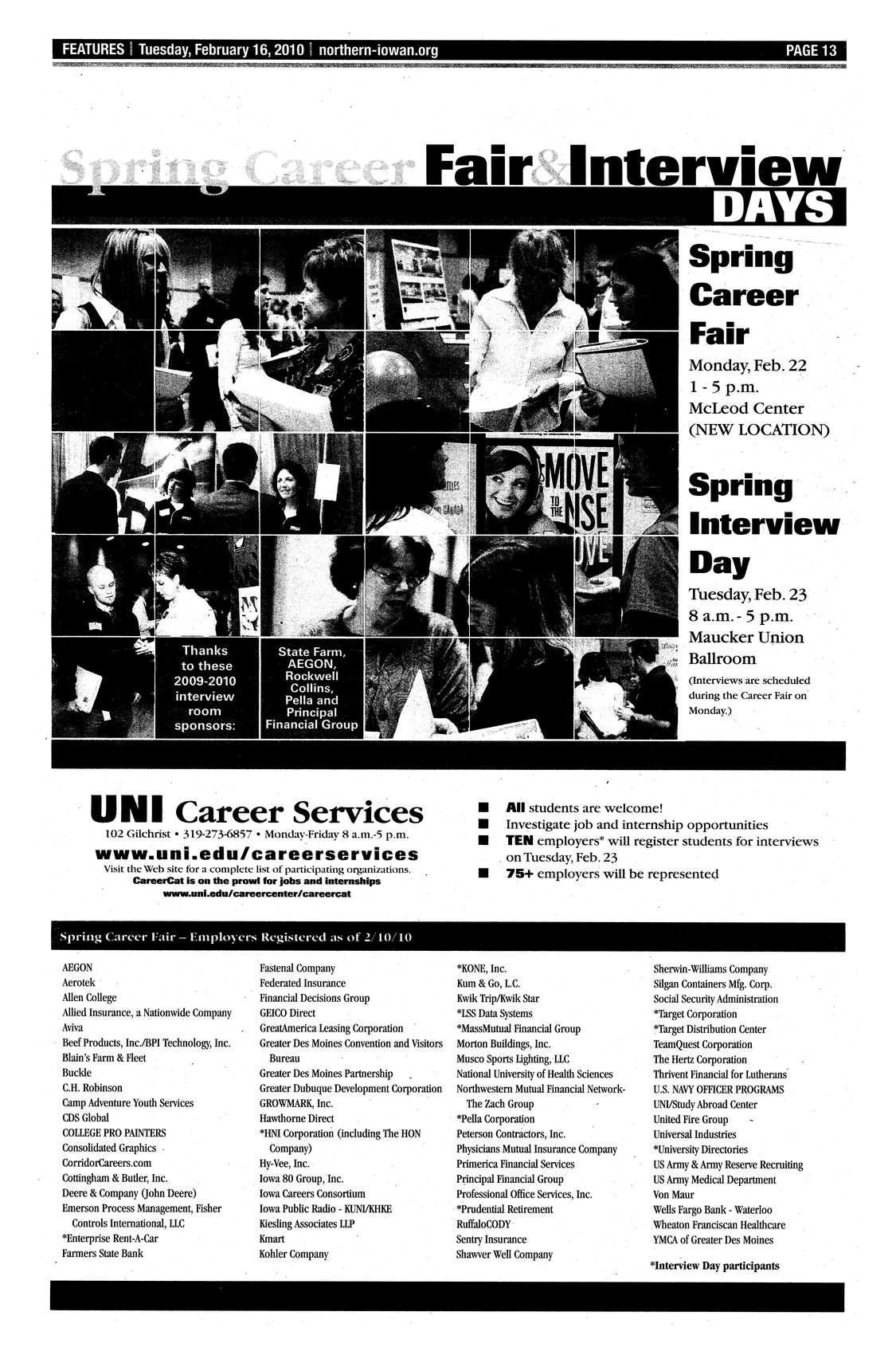 | Spring Career Fair & Interview Days | Dates, times, and places announced for the Career Fair and interviews; photo. |