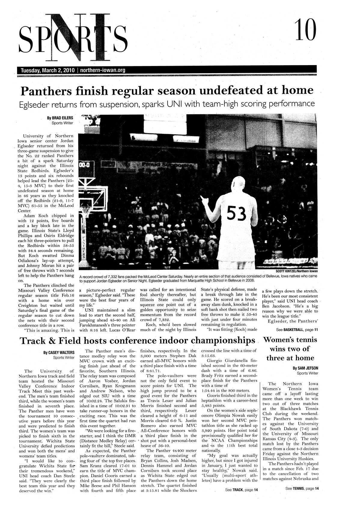 | Track and field hosts conference indoor championships | The Missouri Valley Conference Indoor Championships were held in the UNI-Dome. The UNI men's team finished third and the women finished seventh. |