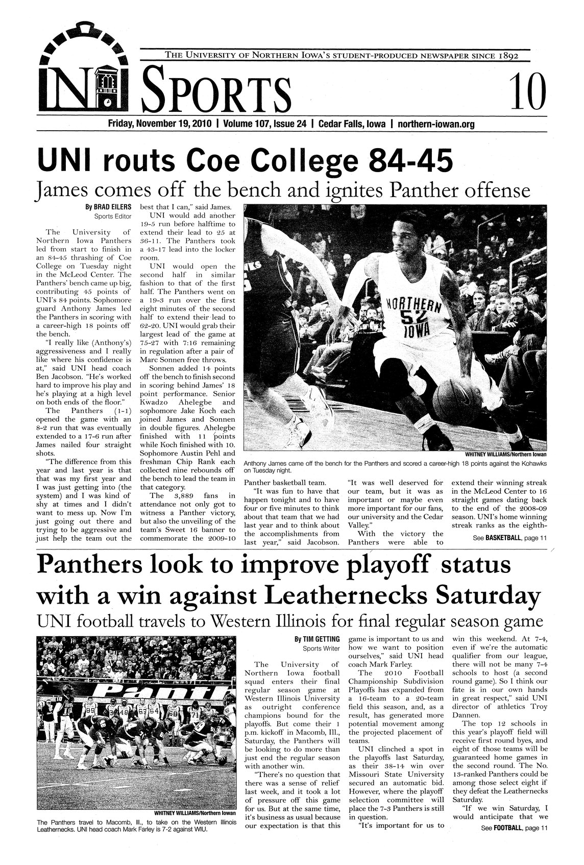 | UNI routs Coe College 84-45 | The support of the bench players was evident in the Panther win. Forty-five points were attributed to players coming off the bench. The leading scorer, Anthony James, had eighteen points off the bench; photo. |