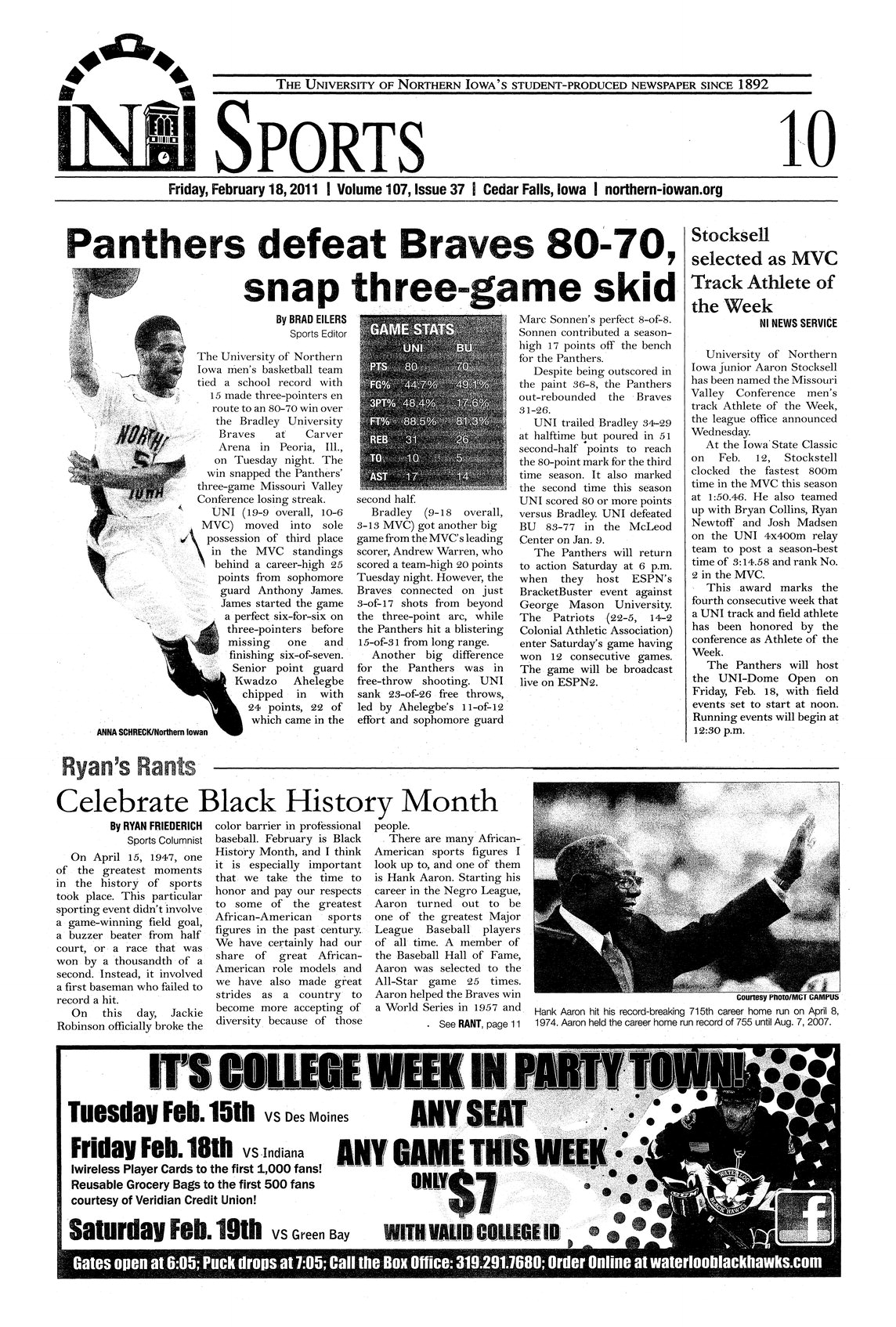 | Panthers defeat Braves 80-70, snap three game skid | Men's basketball team scored a much need victory over Bradley. The Panthers shot over forty eight per cent from the three point line and out rebounded the Braves 31-26; photo. |