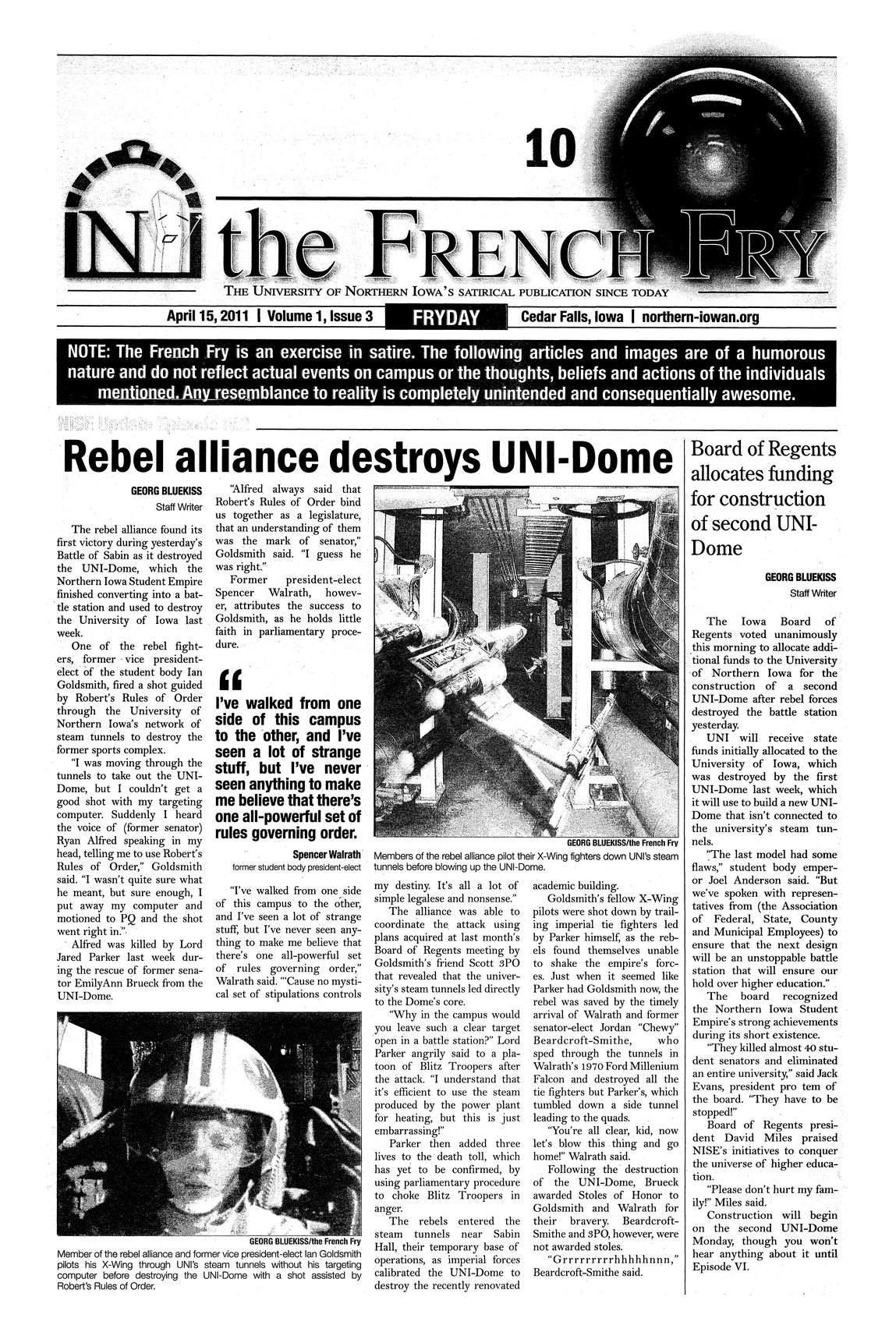 | Board of Regents allocates funding for construction of second UNI-Dome | Another satirical look at replacing the newly destroyed Dome. |