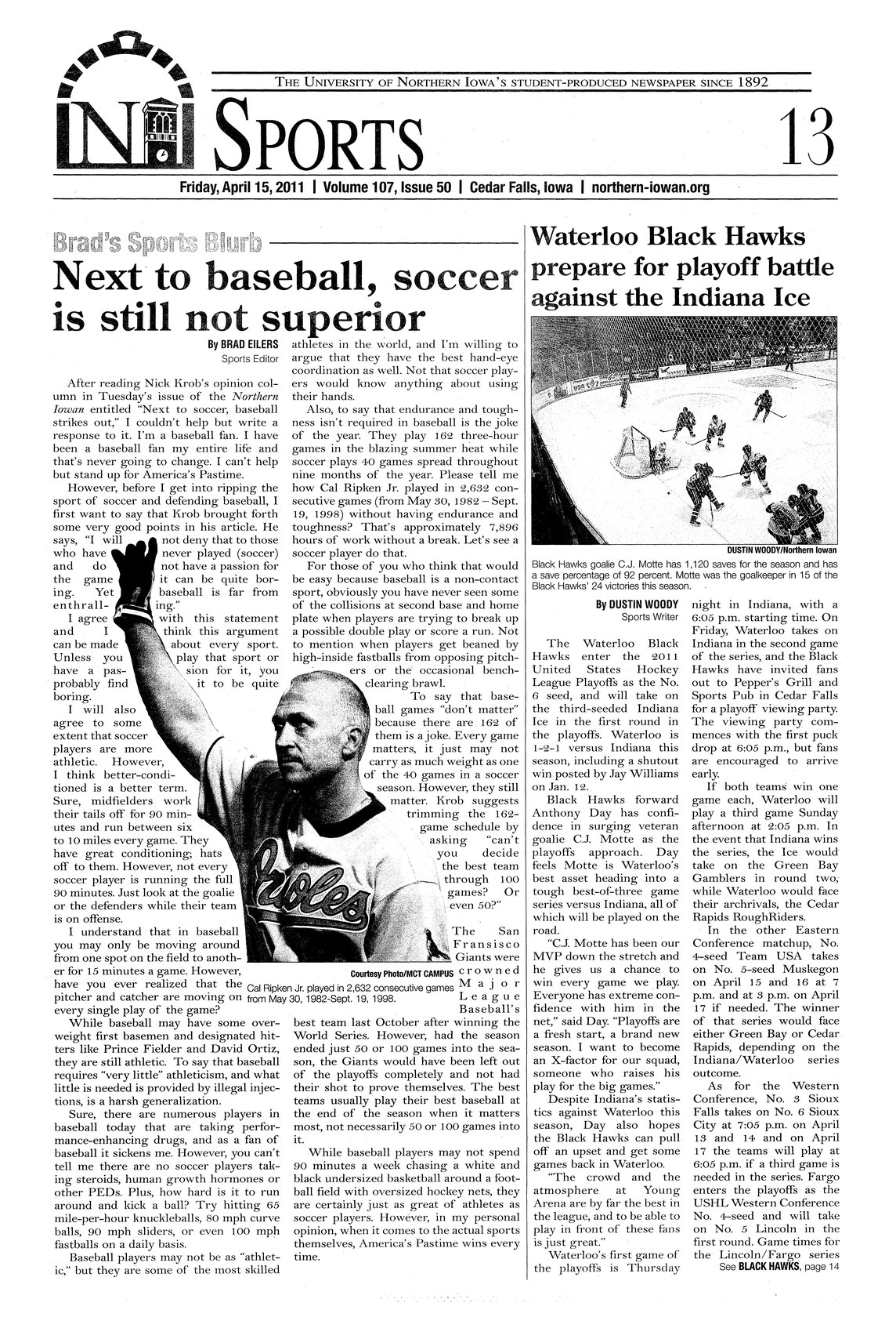 | Next to baseball, soccer is still not superior | Article is written in response to a column that stated that next to soccer, baseball strikes out. Baseball is defended, including the length of the schedule; photo. |