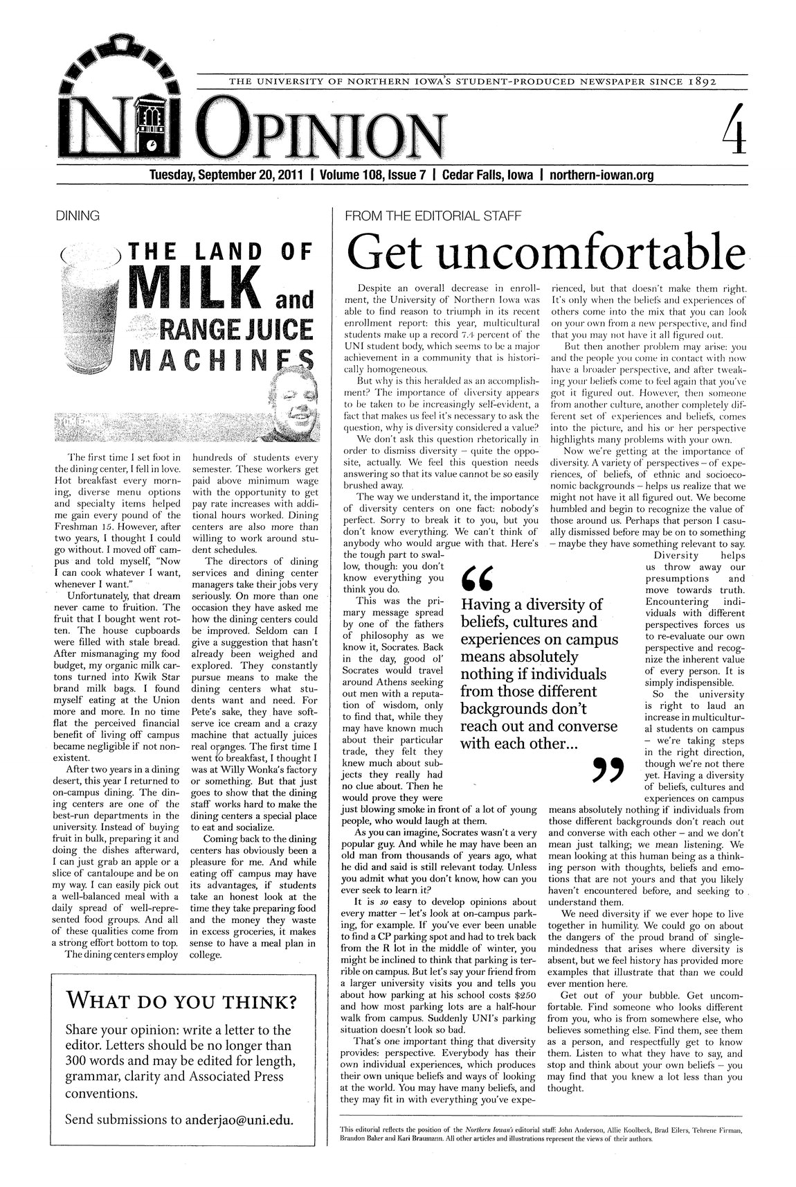 The Land of MILK and range juice machines After two years of living off campus and not eating well, the writer has returned to on-campus dining. The dining centers are well run and supply well balanced meals or healthy snacks. Meal plans are worth the money.