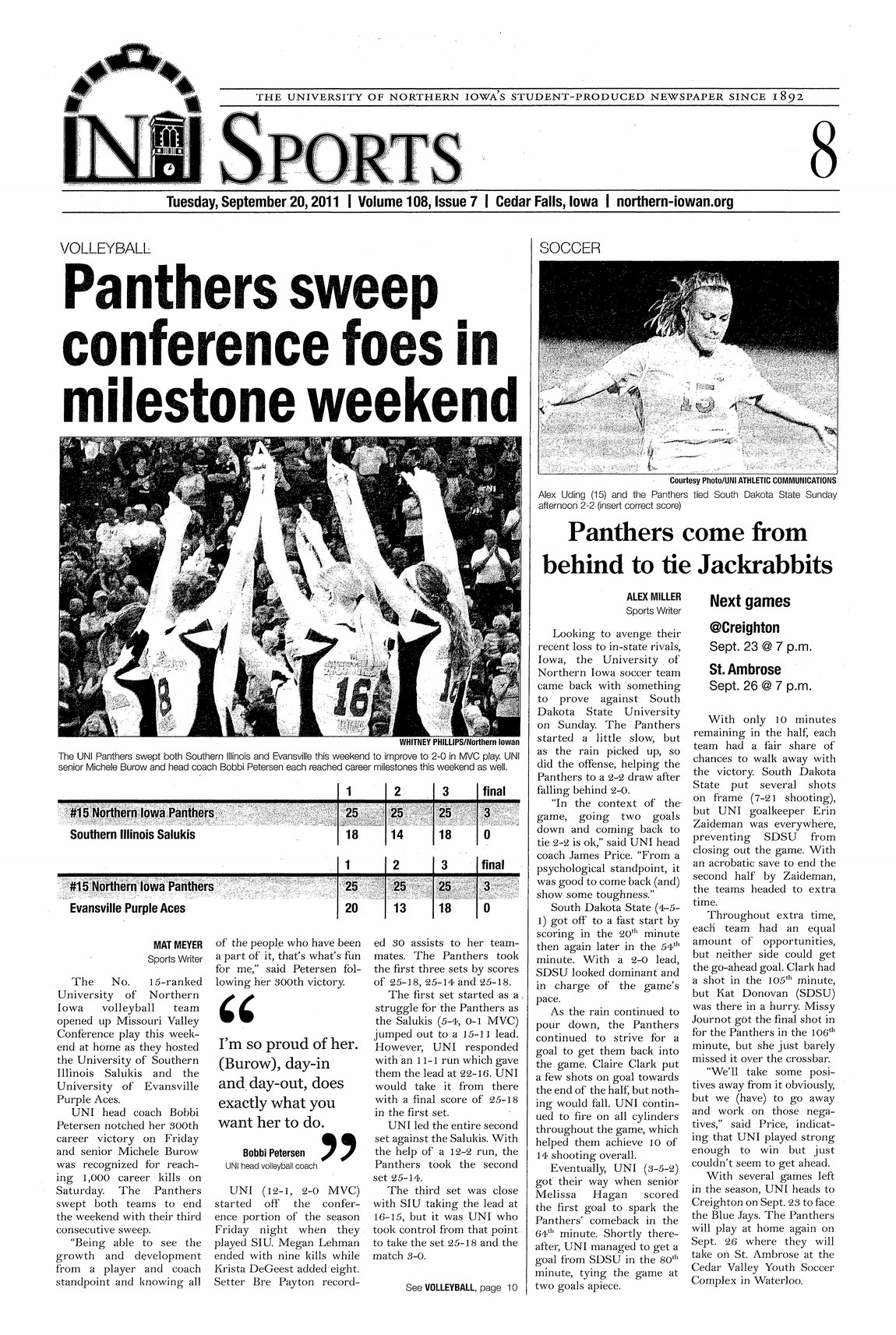 | Panthers sweep conference foes in milestone weekend | Volleyball team defeats Southern Illinois and Evansville by identical scores of 3-0. Head coach, Bobbi Petersen notched her 300th career victory. |