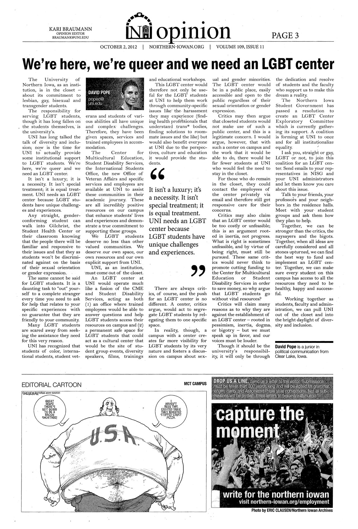 | We're here, we're queer and we need an LGBT center | Column urges improvement of services offered to LGBT students. Expresses concerns of LGBT students in regard to safety and environment. Encourages students to get involved and support this effort. |