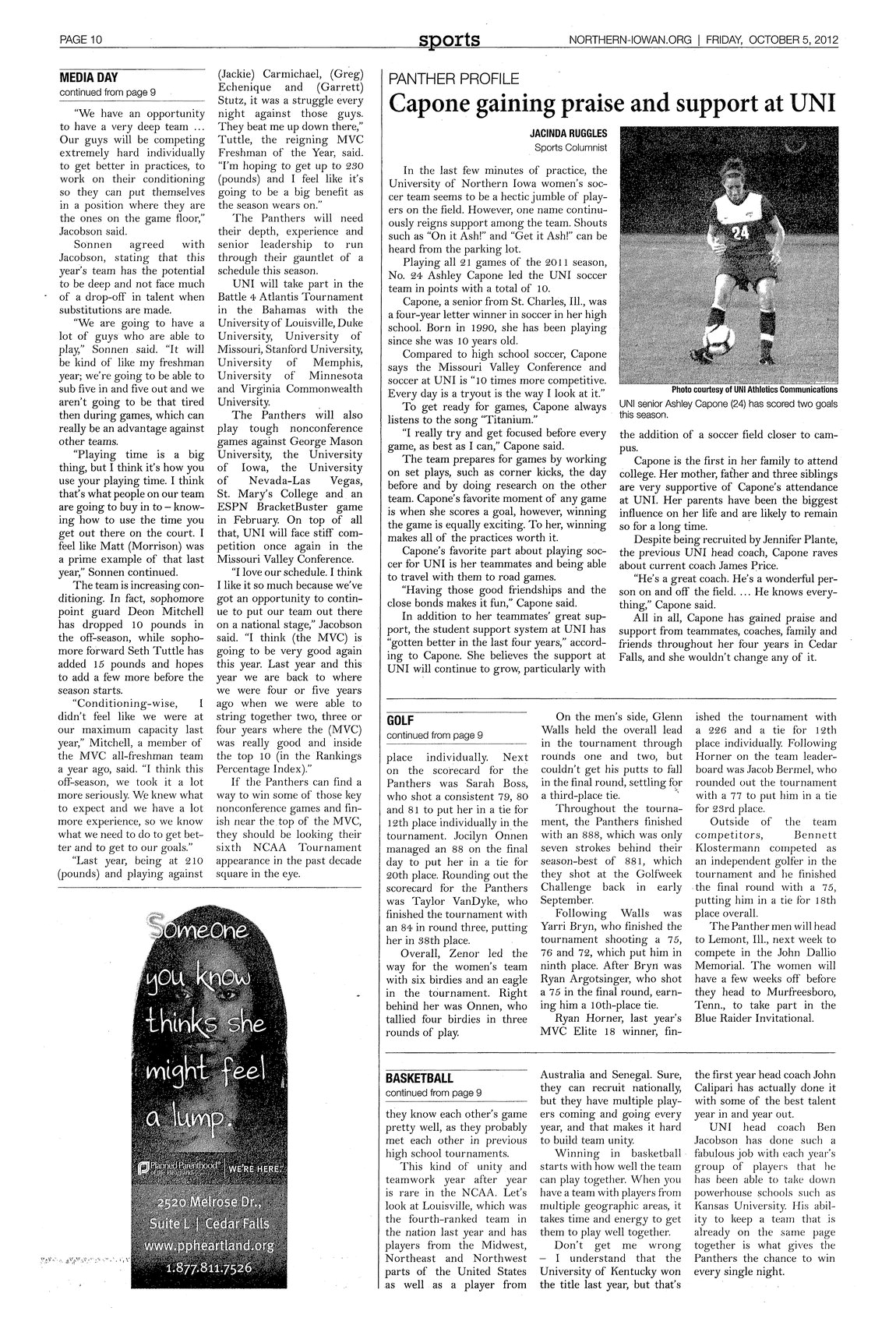 | Capone gaining praise and support at UNI | Women's soccer player Ashley Capone shares information and experiences; photo. |