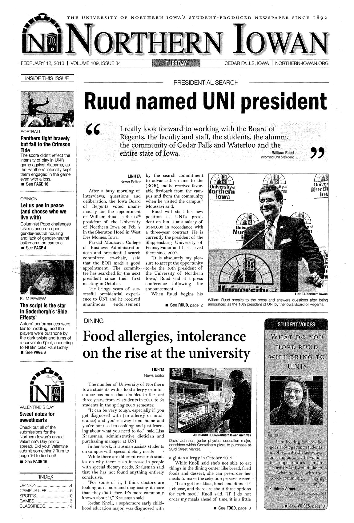 | Ruud named UNI president | Iowa Board of Regents voted unanimously for William Ruud to become the tenth president of UNI. Dean Moussavi commented that President Ruud will bring years of experience to UNI; photo. |