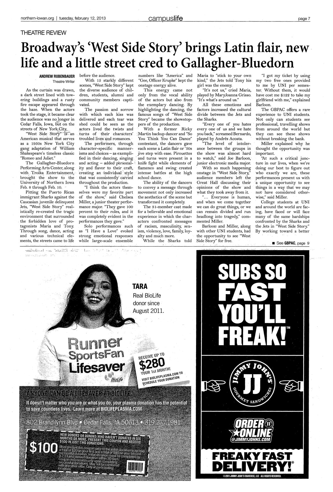 | Broadway's 'West Side Story' brings Latin flair, new life and a little street cred to Gallagher-Bluedorn | The Gallagher-Bluedorn Performing Arts Center, along with Troika Entertainment, brought "West Side Story" to UNI. The show was a hit; it was enjoyed by students, alumni, and community members. |