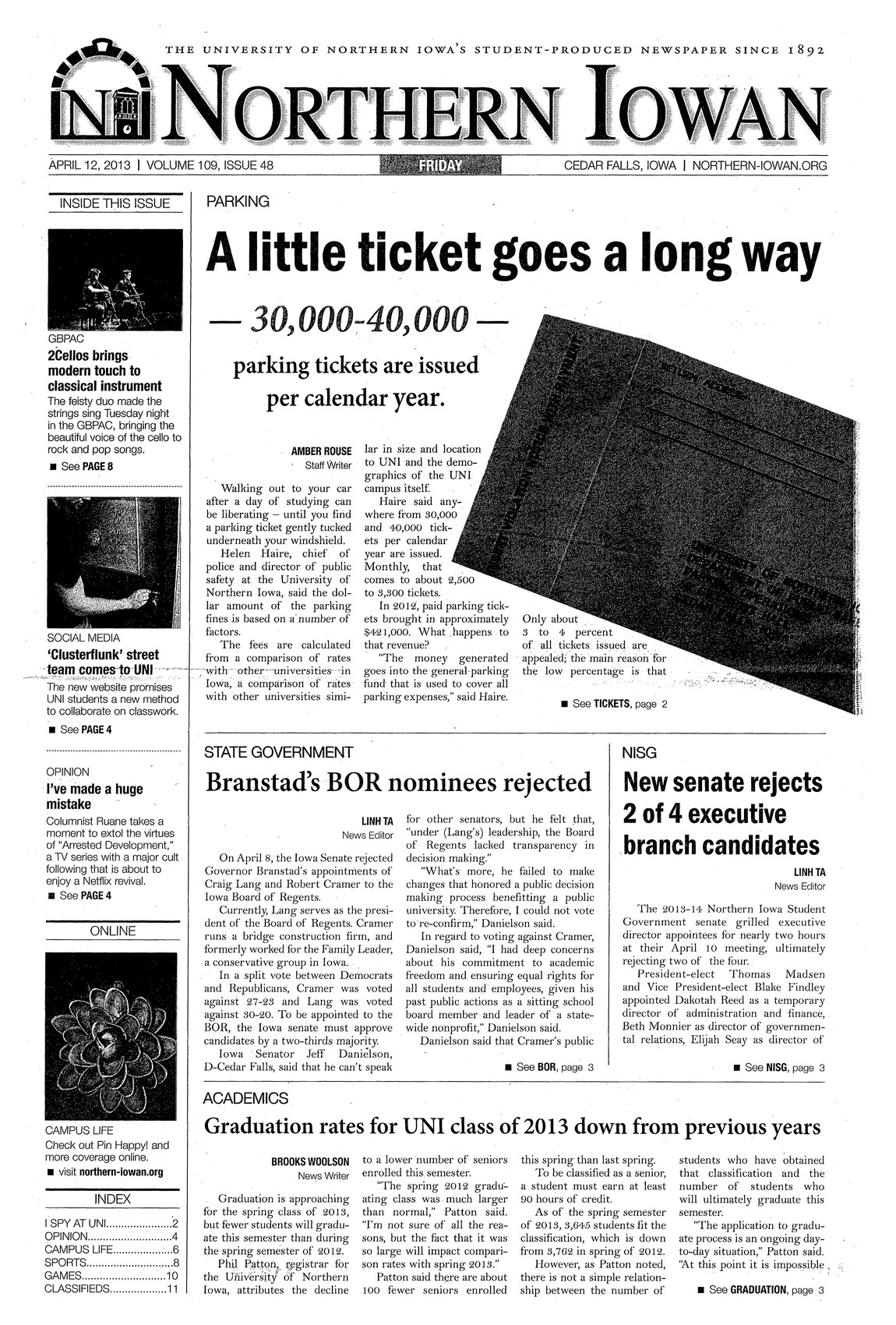 | Parking: a little ticket goes a long way; 30,000-40, 000 parking tickets are issued per calendar year | During an average academic year, the total cost for parking tickets at UNI is approximately $421,000. The money that is collected from these tickets is used to cover all parking expenses; photo. |