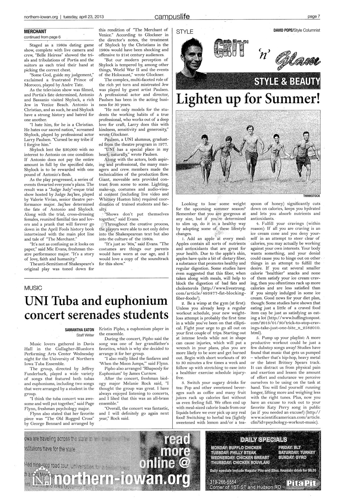 UNI Tuba and euphonium concert serenades students The UNI Tuba Ensemble put on a concert at the Gallagher-Bluedorn Performing Arts Center. The songs featured both tubas and euphoniums, and two songs arranged by student Page Flynn.