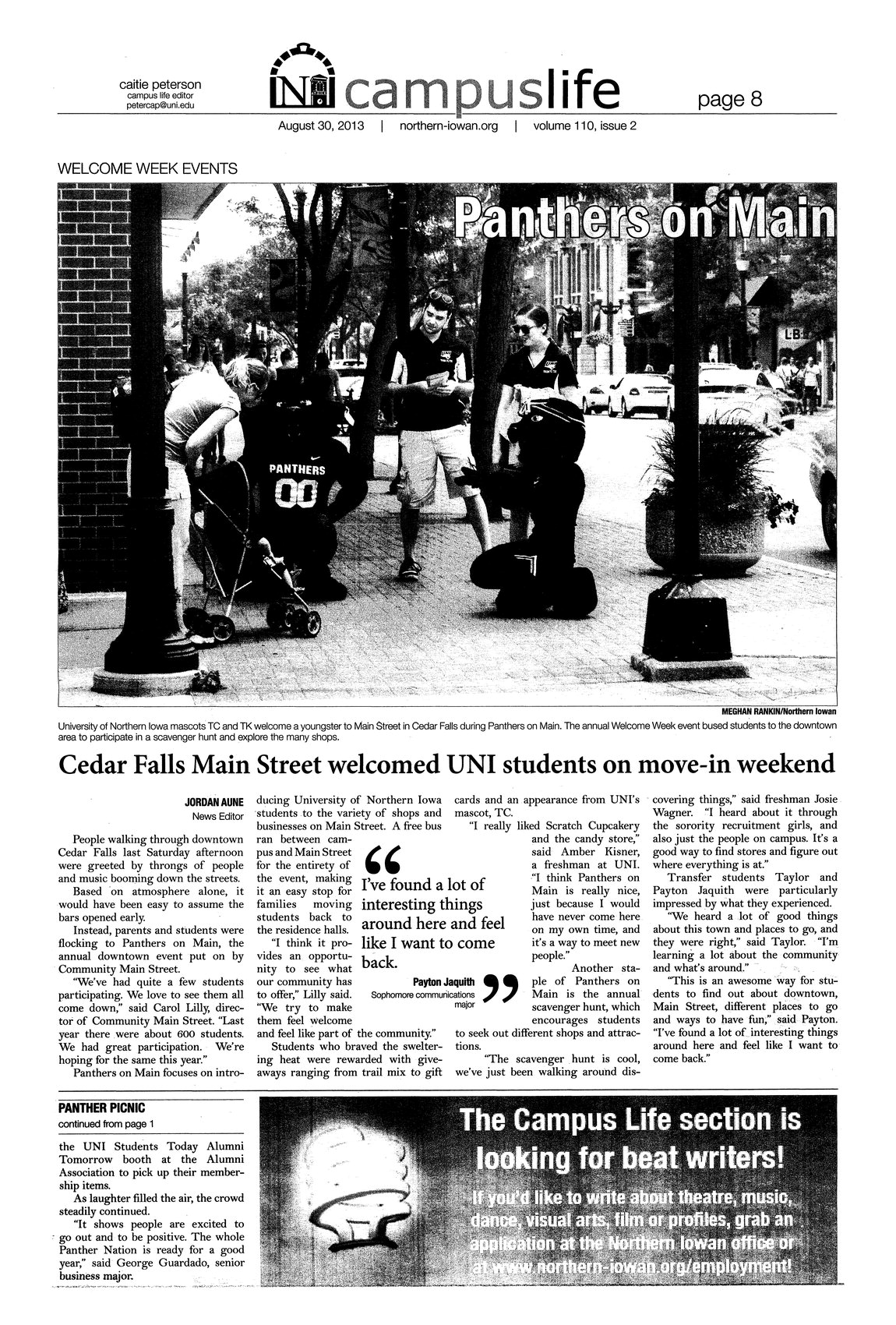 Cedar Falls Main Street welcomed UNI students on move-in weekend Many students participated in the Panthers on Main welcome activity. Students were able to explore the various businesses on Main Street. There were promotions offered by businesses for this event; photo.