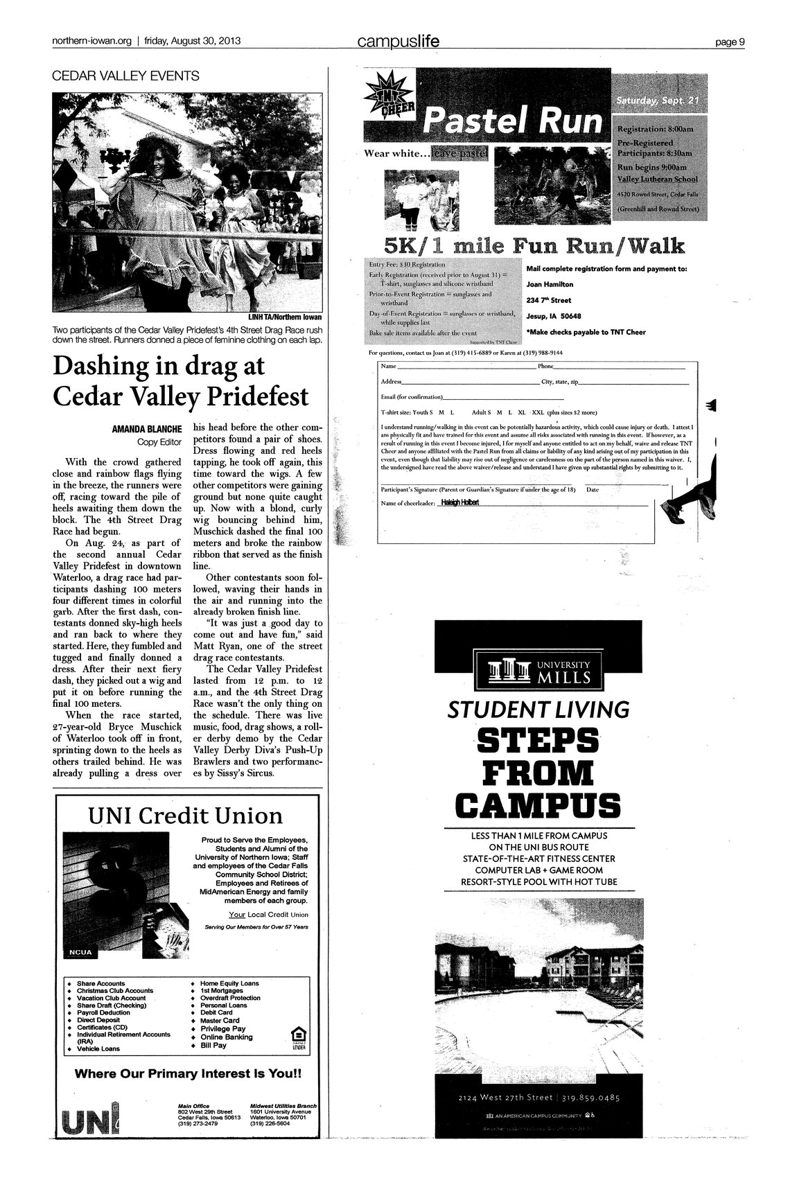 | Dashing in drag at Cedar Valley Pridefest | There were many different events featured at the Cedar Valley Pridefest. One of these events was the 4th Street Drag Race. Participants donned a new article of clothing each leg of the race for a completed drag outfit at the finish; photo. |
