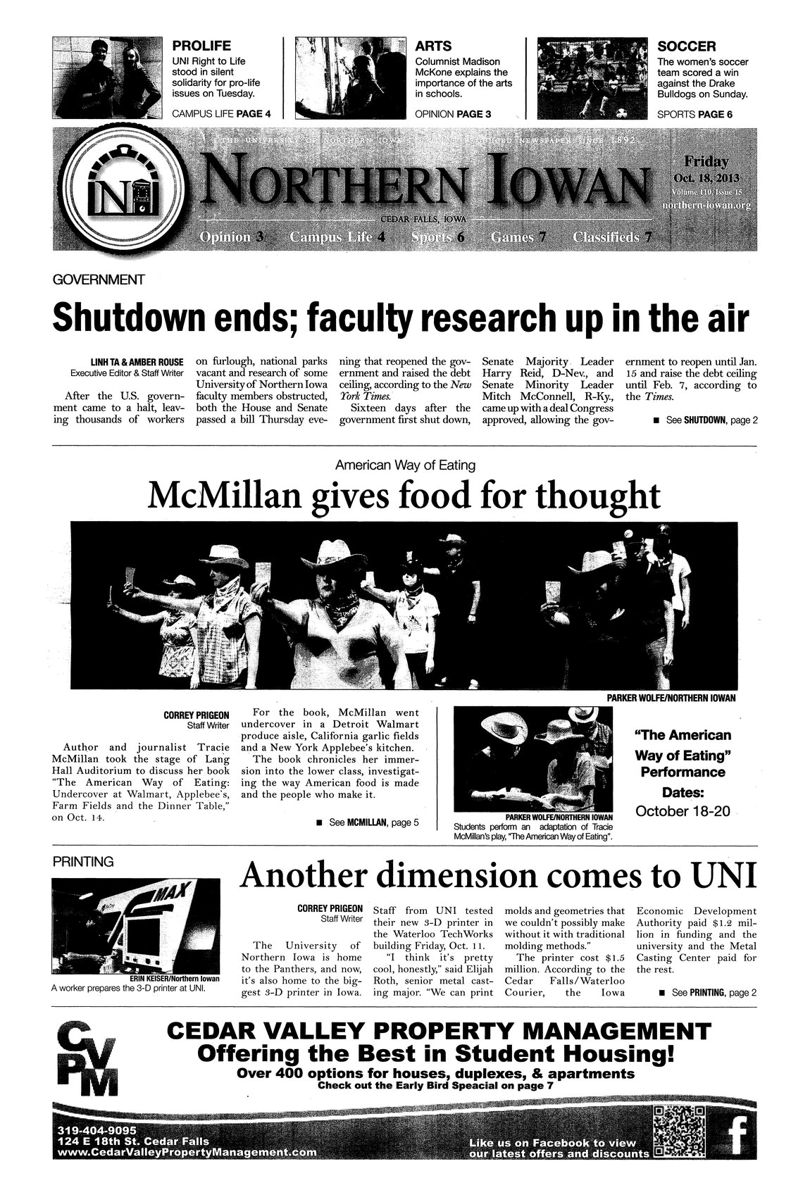 | Shutdown ends; faculty research up in the air | The government shutdown has affected faculty research at UNI. Funding was unavailable during the government shutdown as were as all of the federally-managed websites and services. Faculty hope that things will return to the pre-shutdown state quickly. |