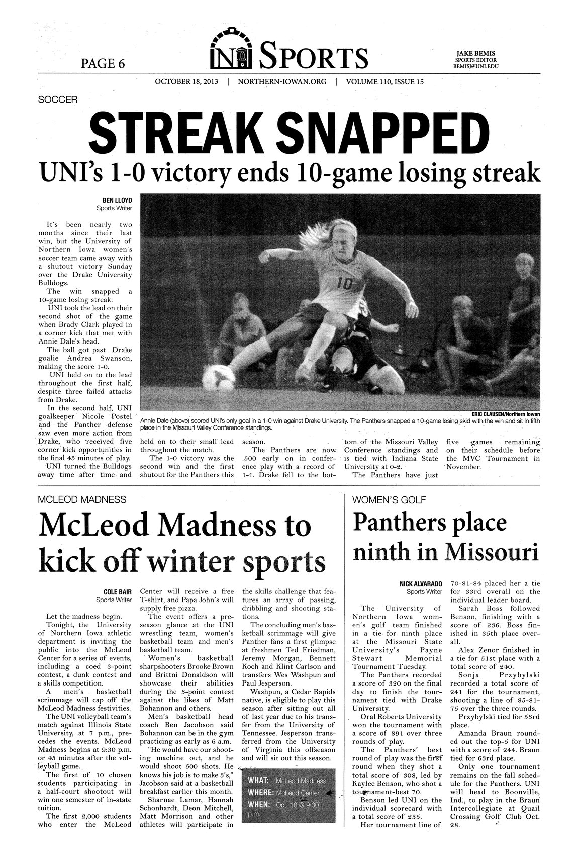 Streaked snapped: UNI's 1-0 victory ends 10-game losing streak Panther soccer was able to end their 10-game losing streak with a victory against Drake University. The victory was the second win and first shutout for the Panthers this season. There are only five games remaining before the MVC Tournament; photo.