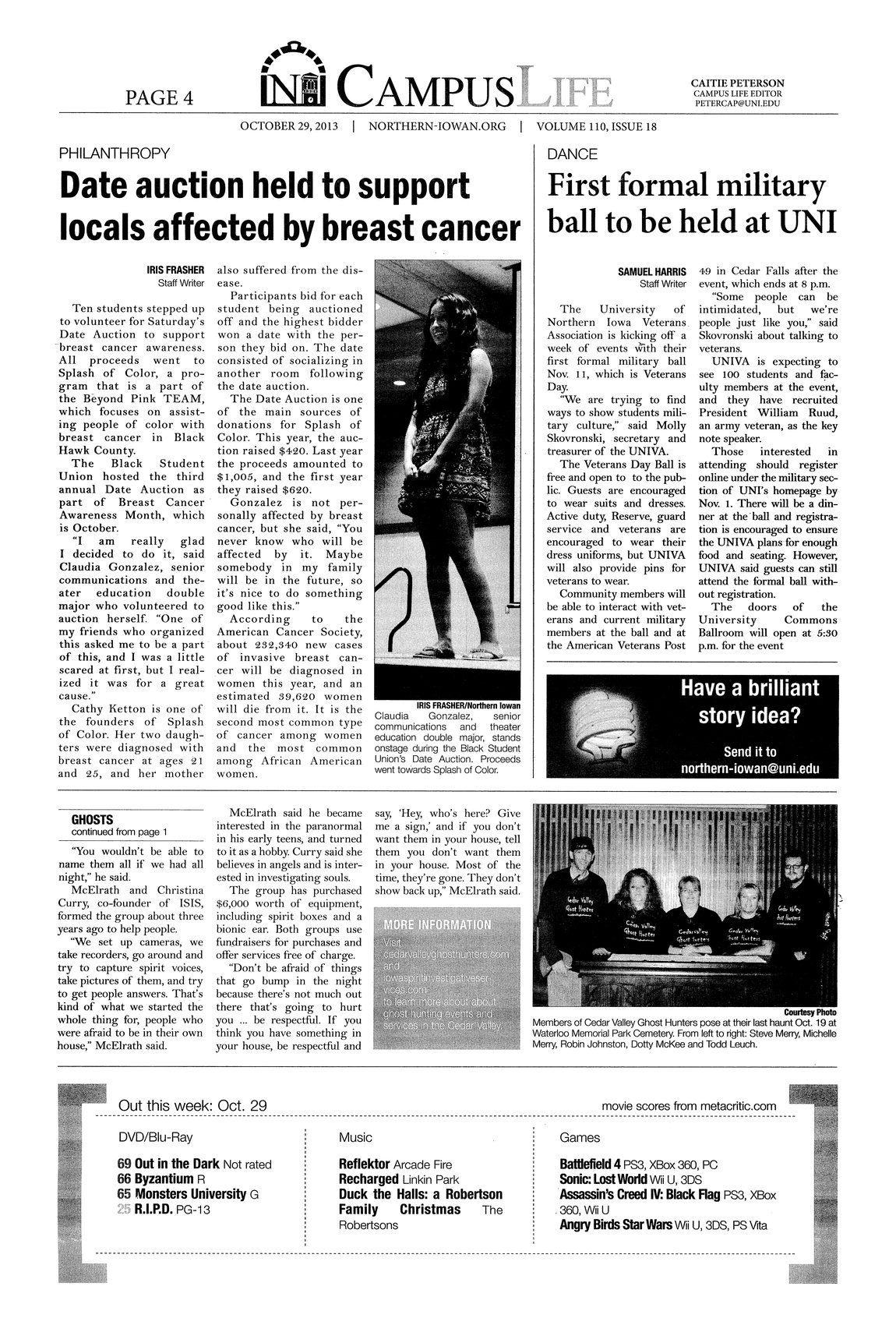 | Date auction held to support locals affected by breast cancer | The Black Student Union sponsored a Date Auction. All proceeds went to Splash of Color, a program that is a part of the Beyond Pink TEAM. This year, the auction raised $420; photo. |