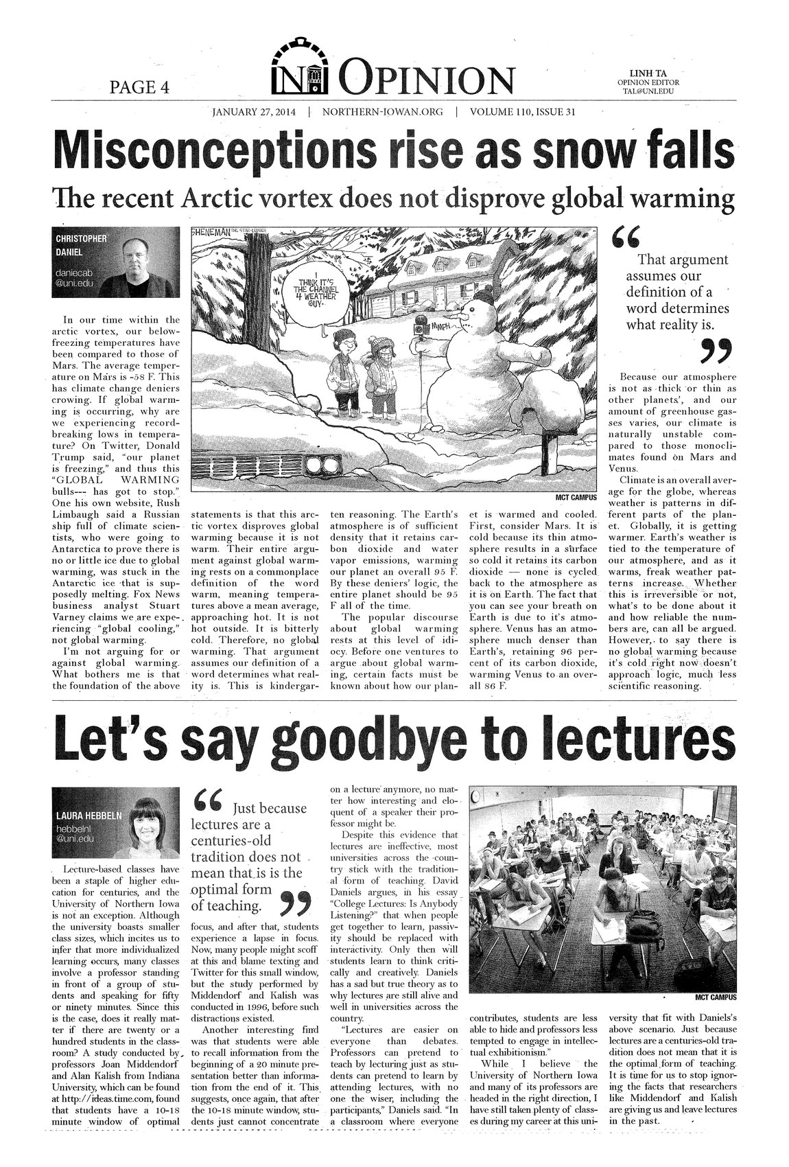 | Misconceptions rise as snow falls: The recent Arctic vortex does not disprove global warming | The author points out that we are experiencing record breaking low temperatures, but this does not disprove global warming. Global warming refers to the overall temperature of the globe, so we cannot base our judgment on one specific area. |